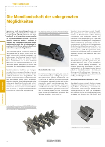 TECHNOLOGIEFR%u00c4SEN BOHREN DREHEN STECHEN INDUSTRIENDie Mondlandschaft der unbegrenzten M%u00f6glichkeitenSpanformer sind Spanbildungselemente am Werkzeug. Sie sorgen daf%u00fcr, dass der entstehende Span gezielt geformt, gebrochen oder abgeleitet wird. Im ISCAR-Portfolio finden sich mehr als 20 unterschiedliche Varianten, die in die Schneide eingepresst werden %u2013 zumindest im Standard. Bei Sonderwerkzeugen zum Stechen und Drehen ist damit aber kein Blumentopf zu gewinnen. Hier helfen nur gelaserte Spanformer und er%u00f6ffnen ungeahnte M%u00f6glichkeiten. %u201eDas Verfahren gibt es zwar schon l%u00e4nger, vor zehn Jahren war es jedoch schlicht nicht rentabel%u201c, erinnert sich Frederik Schmalbach, Produktmanager Non-Rotating Tools bei ISCAR.%u201eEine gelaserte Platte war damals extrem teuer. Heute k%u00f6nnen wir sie dank moderner Maschinen und automatisierter Abl%u00e4ufe zu akzeptablen Preisen anbieten %u2013 vor allem, weil Anwender den unmittelbaren Nutzen sehen.%u201cWo konventionelle Verfahren wie Formpressen oder Sintern von pulverf%u00f6rmigem Hartmetall zu Spanformern an ihre Grenzen sto%u00dfen, er%u00f6ffnet das Lasern neue M%u00f6glichkeiten. Besonders bei Sonderkonstruktionen im Stechen und Stechdrehen bietet diese Technologie deutliche Vorteile: Sie erlaubt eine exakte Gestaltung der Spanleitstufen, ohne die Schneidenh%u00f6he zu ver%u00e4ndern oder Konturen zu verzerren. Gerade bei komplexen Formeinstichen und in schwer zu zerspanenden Werkstoffen sorgt dies f%u00fcr zuverl%u00e4ssige Spankontrolle.Flexibilit%u00e4t bei der FormDas Verfahren ist praxistauglich, das zeigt die wachsende Nachfrage. Anfragen zu gelaserten Spanformern geh%u00f6ren mittlerweile zum Alltag %u2013 sei es, weil ein Standardspanformer nicht ausreicht oder weil Kunden bei Sondergeometrien gezielt nach L%u00f6sungen zur Spankontrolle suchen. Anwendungen reichen von der Medizintechnik bis hin zur Bearbeitung gro%u00dfer Werkst%u00fccke mit speziellen Einstichbreiten. In manchen F%u00e4llen wird der Spanformer sogar nur partiell eingelasert, um genau dort Wirkung zu zeigen, wo es n%u00f6tig ist.Technisch bietet das Lasern gro%u00dfe Flexibilit%u00e4t. Spanformer aus dem Standardportfolio k%u00f6nnen im Sonderbereich nahezu beliebig nachgebildet oder modifiziert werden. Entscheidend ist die Anpassung an die konkreten Anforderungen: Werkst%u00fcckstoff, Vorschub und Maschinenparameter bestimmen, welche Geometrie sinnvoll ist. So l%u00e4sst sich beispielsweise die Breite einer Schutzfase exakt auf den vom Kunden gefahrenen Vorschub abstimmen. Ist dieser zu klein, greift der Spanformer nicht; bei h%u00f6heren Vorsch%u00fcben kann die Fase breiter ausgelegt werden, was wiederum die Standzeit erh%u00f6ht.Eine Herausforderung liegt in der Oberfl%u00e4chenstruktur der gelaserten Spanmulden. %u201eUnter dem Mikroskop wirkt sie wie eine Mondlandschaft%u201c, erkl%u00e4rt Frederik Schmalbach. %u201eIm hinteren Bereich des Spanformers ist das unproblematisch, an der Hauptschneide f%u00fchrt es jedoch zu Standzeitverlusten %u2013 deshalb auch die eingeschliffene Schutzfase.%u201c Mit neuen Laserquellen arbeitet ISCAR daran, diesen Schritt k%u00fcnftig %u00fcberfl%u00fcssig zu machen.Wirtschaftliches PENTA-System als BasisGrunds%u00e4tzlich lassen sich alle Stechwerkzeuge mit gelaserten Spanformern ausstatten, in der Regel dienen aber Rohlinge aus ISCARs wirtschaftlichem, f%u00fcnfschneidigen PENTACUT-Pr%u00e4zisionsstechsystem als Basis. Die Schneideinsatz-Rohlinge sind in verschiedenen Varianten verf%u00fcgbar und k%u00f6nnen zum Ab-, Profil- und %u2026 und die PENTA 27 f%u00fcrs Profilstechen.In der Regel dienen Rohlinge aus ISCARs PENTACUT-Pr%u00e4zisionsstechsystem als Basis f%u00fcr Sonder-Stechwerkzeuge. Etwa die PENTA 34 f%u00fcrs Ein- und Abstechen %u2026Der Spanformer basiert auf Standard-Varianten, die genauan die Anforderungen beim Anwender angepasst werden, etwa f%u00fcr Aufgaben in der Medizintechnik.52
