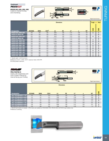 TURNING11aWF 20%u00b0 RELU 8%u00b0CDXLFDCONMSDMINRight-hand shownPICCO R/L 050, 053, 055Inserts for Internal Turning and ChamferingLF5%u00b08%u00b0RE 20%u00b0 CDXaWFDCONMSLURight-hand shownDimensionsDesignation DCONMS DMIN CDX(1) LU RE LF a WF IC908PICJ RT20D40R10-10C .157 .157 .012 .3543 .004 .945 .138 .059 %u2022 PICJ RT20D40R10-20C .157 .157 .012 .7480 .004 1.339 .138 .059 %u2022 PICJ RT20D40R10-28C .157 .157 .012 1.0630 .004 1.654 .138 .059 %u2022 PICJ RT20D50R15-20C .197 .197 .020 .7480 .006 1.378 .173 .075 %u2022 PICJ RT20D60R15-15C .236 .236 .020 .5512 .006 1.181 .209 .091 %u2022 PICJ RT20D60R15-22C .236 .236 .020 .8268 .006 1.457 .209 .091 %u2022 PICJ RT20D70R15-20C .276 .268 .024 .7480 .006 1.378 .248 .110 %u2022 %u2022 All left-hand inserts on request %u2022 PICJ items are suitable for PICCO/MG PCO, PICCO ACE, SC-PICCO type holders only(1) Minimum overhang PICJ R/LT20-CInserts with Chipformers and Inner Coolant Channel for Internal Boring and ProfilingDimensions Tough 1 HardDesignation DCONMS DMIN CDX(2) LU RE LF a WF IC228 IC908PICCO R/L 050.6-22 .236 .236 .020 .8268 .006 1.457 .209 .091 %u2022 %u2022 PICCO R 055.6-25 .236 .236 .020 .9449 .002 1.575 .209 .091 %u2022 PICCO R/L 050.6-25 .236 .236 .020 .9449 .006 1.575 .209 .091 %u2022 %u2022 PICCO R 055.6-30 .236 .236 .020 1.1417 .002 1.772 .209 .091 %u2022 PICCO R/L 050.6-30 .236 .236 .020 1.1417 .006 1.772 .209 .091 %u2022 %u2022 PICCO R/L 050.6-35 .236 .236 .020 1.3386 .006 1.968 .209 .091 %u2022 %u2022 PICCO R/L 050.6-42 .236 .236 .020 1.6142 .006 2.244 .209 .091 %u2022 %u2022 PICCO R/L 050.7-20 .276 .268 .024 .7480 .006 1.378 .248 .110 %u2022 %u2022 PICCO R/L 050.7-25 .276 .268 .024 .9449 .006 1.575 .248 .110 %u2022 %u2022 PICCO R/L 050.7-30 .276 .268 .024 1.1417 .006 1.772 .248 .110 %u2022 %u2022 PICCO R/L 050.7-35 .276 .268 .024 1.3386 .006 1.968 .248 .110 %u2022 %u2022 PICCO R/L 050.7-40 .276 .268 .024 1.5354 .006 2.165 .248 .110 %u2022 %u2022 PICCO R/L 050.7-45 .276 .268 .024 1.7323 .006 2.362 .248 .110 %u2022 %u2022 PICCO R/L 050.7-50 .276 .268 .024 1.9291 .006 2.559 .248 .110 %u2022 %u2022%u2022 Specify right- or left-hand bars(1) Maximum D.O.C.=.0004-.0012%u201d, maximum feed=.0004 IPR. (2) Cutting depth maximum Continued