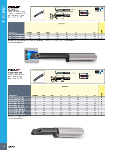 TURNING14 ISCARaWF 20%u00b0 RE8%u00b0CDXLFDCONMSLU DMINDimensionsDesignation DCONMS DMIN CDX(1) LU RE LF a WF IC902PICCO R/LHD 050.2-5 .157 .079 .004 .1575 .002 .748 .067 - %u2022 PICCO RHD 050.3-10 .157 .110 .008 .3543 .004 .945 .102 .024 %u2022 PICCO RHD 050.3-16 .157 .110 .008 .5906 .004 1.181 .102 .024 %u2022 PICCO RHD 050.4-10 .157 .157 .012 .3543 .004 .945 .138 .059 %u2022 PICCO RHD 050.4-20 .157 .157 .012 .7480 .004 1.339 .138 .059 %u2022 PICCO RHD 050.5-15 .197 .197 .020 .5512 .006 1.181 .173 .075 %u2022 PICCO R/LHD 050.6-15 .236 .236 .020 .5512 .006 1.181 .209 .091 %u2022 PICCO RHD 050.7-20 .276 .268 .024 .7480 .006 1.378 .248 .110 %u2022 PICCO RHD 050.7-25 .276 .268 .024 .9449 .006 1.575 .248 .110 %u2022 PICCO R/LHD 050.7-35 .276 .268 .024 1.3386 .006 1.968 .248 .110 %u2022 %u2022 Specify right- or left-hand bars(1) Cutting depth maximum PICCO R/LHD 050Inserts for Internal Turning and Chamfering Hard Steel - Up to 65 HRCaWF RE 20%u00b08%u00b0CDXLFDCONMSLU DMINDimensionsDesignation DCONMS DMIN CDX(1) LU RE LF a WF IC902PICJ RT20D30R10-16 .157 .110 .008 .5906 .004 1.181 .102 .024 %u2022 PICJ RT20D40R10-20 .157 .157 .012 .7480 .004 1.339 .138 .059 %u2022 PICJ RT20D70R15-20 .276 .268 .024 .7480 .006 1.378 .248 .110 %u2022 %u2022 Specify right- or left-hand bars %u2022 PICJ items are suitable for PICCO/MG PCO, PICCO ACE, SC-PICCO type holders only(1) Cutting depth maximum PICJ R/LT20-HInserts with Inner Coolant Channel for Internal Turning and Chamfering of Hard Steel - Up to 65 HRC