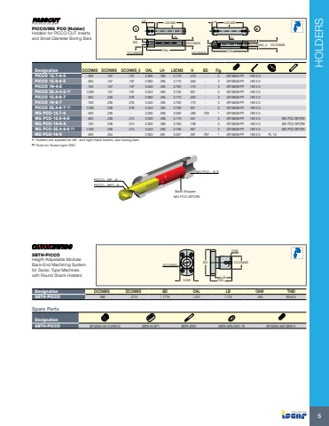 HOLDERS5 H HLH LSCMS LSCMSOAL OALDCONMS DCONMS BDDCONWS DCONWSDCONWS_2LH1 2Designation DCONMS DCONWS DCONWS_2 OAL LH LSCMS H BD Fig.PICCO 12.7-4-5 .500 .157 .197 2.950 .394 2.170 .410 - 2 SR M5X4-PF HW 2.5PICCO 15.9-4-5 .625 .157 .197 2.950 .394 2.170 .550 - 2 SR M5X6-PF HW 2.5PICCO 19-4-5 .750 .157 .197 3.540 .394 2.760 .710 - 2 SR M5X6-PF HW 2.5PICCO 25.4-4-5 (1) 1.000 .157 .197 3.543 .394 2.756 .921 - 2 SR M5X6-PF HW 2.5PICCO 15.9-6-7 .625 .236 .276 2.950 .394 2.170 .550 - 2 SR M5X6-PF HW 2.5PICCO 19-6-7 .750 .236 .276 3.540 .394 2.760 .710 - 2 SR M5X6-PF HW 2.5PICCO 25.4-6-7 (1) 1.000 .236 .276 3.543 .394 2.756 .921 - 2 SR M5X6-PF HW 2.5MG PCO-12.7-6 .500 .236 - 3.000 .590 2.090 .460 .709 1 SR M5X6-PF HW 2.5MG PCO-15.9-6-8 .625 .236 .315 3.000 .390 2.170 .551 - 2 SR M5X6-PF HW 2.5 MG PCO-SPCR8MG PCO-19-6-8 .750 .236 .315 3.500 .390 2.760 .709 - 2 SR M5X6-PF HW 2.5 MG PCO-SPCR8MG PCO-25.4-6-8 (1) 1.000 .236 .315 3.543 .394 2.756 .921 - 2 SR M5X6-PF HW 2.5 MG PCO-SPCR8MG PCO-16-9 .630 .354 - 2.953 .591 2.087 .591 .787 1 SR M5X6-PF HW 2.5 PL 16%u2022 Holders are suitable for left- and right-hand inserts, and boring bars(1) Tools for Swiss-type CNC MG PCO...-6-8Back StopperMG PCO-SPCR8PICCO...MFT...8-...PICCO...MF...8-...PICCO/MG PCO (Holder)Holders for PICCO-CUT Inserts and Small Diameter Boring BarsOAWDCONWS BD DCONMSOALLBTHIDDesignation DCONMS DCONWS BD OAL LB OAW THIDSBTH-PICCO .866 .4724 1.7716 1.457 1.102 .945 M5x0.5Spare PartsDesignationSBTH-PICCO SR M5X0.5X16 DIN913 SBTA-IK-SP1 SBTA-ZEN1 SBTA-QR5.28X1.78 SR M5X0.5X8 DIN913SBTH-PICCOHeight-Adjustable Modular Back-End Machining System for Swiss -Type Machines with Round Shank Holders