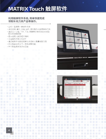 MATRIX Touch 触屏软件 利用触屏软件系统,简单快捷完成 领取补充刀具产品等操作。 •全系产品通用一套软件系统 •通过名称、编号、分组、图片、频次等方式检索库存刀具 •通过用户分组、工件、工序、预算等多种多样的方式控 制刀具领用权限 •提示通用刀具及相关物料 •可连接电子样本及APP •通过购物车功能实现单次多品种大数量领取刀具 •库存短缺及库存不一致等预警功能 •单个数据库实现多点互联 4