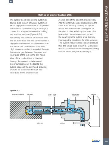 237DEEP HOLE DRILLINGMethod of Ejector System DTSThe ejector deep hole drilling system or double pipe system (DTS) is a system in which high pressure coolant is supplied to the machine spindle directly or through a connection adapter between the drilling tool and the machine (Figure 6.7.1.1).The drilling tool consists of an outer tube and an inner tube that are connected to a high-pressure coolant supply on one side and to the drill head on the other side. High pressure coolant is supplied through the annular gap between the outer and inner pipe of the tool to the drill head. Most of the coolant flow is directed through the coolant outlets around the circumference of the tool to the cutting edges of the drill head, allowing chips to be evacuated through the inner tube to the chip receiver. A small part of the coolant is fed directly into the inner tube via a sloped slot in the inner tube, thereby creating an ejector effect. The coolant flow coming out of the slots is directed along the inner pipe hole axis to its outlet end and sucks in the swarf from the cutting area, thereby improving the conditions for chip removal. This system requires less coolant pressure than the single tube system (STS) and can be successfully used on existing machining centers without significant changes.Figure 6.7.1.1workpiece material drill head outer tubeinner tubedouble tube connectormachinepilot hole stopper