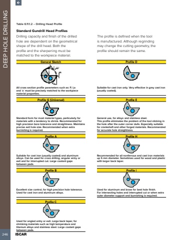 246 ISCAR DEEP HOLE DRILLINGTable 6.11.1.2 %u2013 Drilling Head ProfileStandard Gundrill Head Profiles Drilling capacity and finish of the drilled hole are dependent on the geometrical shape of the drill head. Both the profile and the sharpening must be matched to the workpiece material.The profile is defined when the tool is manufactured. Although regrinding may change the cutting geometry, the profile should remain the same.General Sketch Profile DLa%u00d8D%u03b1PAll cross section profile parameters such as: P, La and %u2018a%u2019 must be precisely matched to the workpiece material properties.Suitable for cast iron only. Very effective in grey cast iron (usually coated).Profile G (Universal) Profile EStandard form for most material types, particularly for materials with a tendency to shrink. Recommended for high precision bore tolerance and straightness. Maintains precise exit hole size. Recommended when extra burnishing is required.General use, for alloys and stainless steel. This profile eliminates the problem of the tool sticking in the hole after the outer corner dulls. Especially suitable for crankshaft and other forged materials. Recommended for accurate hole straightness.Profile A Profile HSuitable for cast iron (usually coated) and aluminum alloys. Can be used for cross drilling, angular entry or exit and for interrupted cut. Large coolant gaps between pads.Recommended for all nonferrous and cast iron materials up 5 mm diameter. Sometimes used for wood and plastic with larger back taper.Profile B Profile IExcellent size control, for high precision hole tolerance. Used for cast iron and aluminum alloys.Used for aluminum and brass for best hole finish. For intersecting holes and interrupted cut or when extra outer diameter support and burnishing is required.Profile CUsed for angled entry or exit. Large back taper, for shrinking materials such as high temperature and titanium alloys and stainless steel. Large coolant gaps between pads.