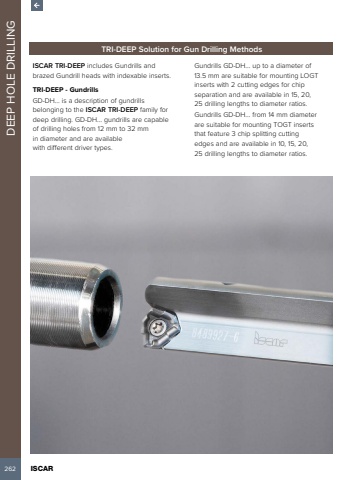 262 ISCAR DEEP HOLE DRILLINGTRI-DEEP Solution for Gun Drilling MethodsISCAR TRI-DEEP includes Gundrills and brazed Gundrill heads with indexable inserts.TRI-DEEP - GundrillsGD-DH%u2026 is a description of gundrills belonging to the ISCAR TRI-DEEP family for deep drilling. GD-DH%u2026 gundrills are capable of drilling holes from 12 mm to 32 mm in diameter and are available with different driver types.Gundrills GD-DH%u2026 up to a diameter of 13.5 mm are suitable for mounting LOGT inserts with 2 cutting edges for chip separation and are available in 15, 20, 25 drilling lengths to diameter ratios.Gundrills GD-DH%u2026 from 14 mm diameter are suitable for mounting TOGT inserts that feature 3 chip splitting cutting edges and are available in 10, 15, 20, 25 drilling lengths to diameter ratios.