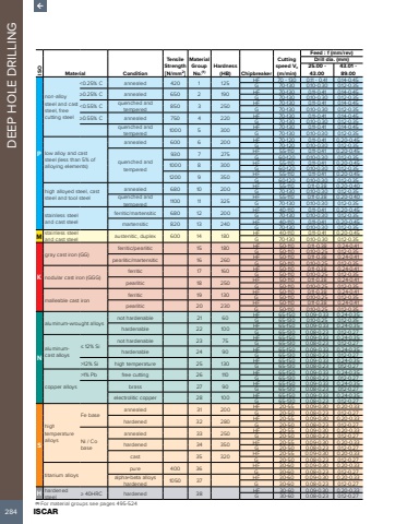 284 ISCAR DEEP HOLE DRILLING ISOMaterial ConditionTensile Strength [N/mm2]Material Group No.(1)Hardness (HB) ChipbreakerCutting speed Vc(m/min)Feed : f (mm/rev)Drill dia. (mm)25.00 - 43.0043.01 - 89.00Pnon-alloy steel and cast steel, free cutting steel<0.25% C annealed 420 1 125 HF 70 - 130 0.11 - 0.41 0.14-0.45G 70-130 0.10-0.30 0.12-0.35%u22650.25% C annealed 650 2 190 HF 70-130 0.11-0.41 0.14-0.45G 70-130 0.10-0.30 0.12-0.35<0.55% C quenched and tempered 850 3 250 HF 70-130 0.11-0.41 0.14-0.45G 70-130 0.10-0.30 0.12-0.35%u22650.55% C annealed 750 4 220 HF 70-130 0.11-0.41 0.14-0.45G 70-130 0.10-0.30 0.12-0.35quenched and tempered 1000 5 300 HF 70-130 0.11-0.41 0.14-0.45G 70-130 0.10-0.30 0.12-0.35low alloy and cast steel (less than 5% of alloying elements)annealed 600 6 200 HF 70-120 0.11-0.41 0.20-0.45G 70-120 0.10-0.30 0.12-0.35quenched and tempered930 7 275 HF 55-110 0.11-0.41 0.20-0.45G 60-120 0.10-0.30 0.12-0.351000 8 300 HF 55-110 0.11-0.41 0.20-0.45G 60-120 0.10-0.30 0.12-0.351200 9 350 HF 55-110 0.11-0.41 0.20-0.45G 60-120 0.10-0.30 0.12-0.35high alloyed steel, cast steel and tool steelannealed 680 10 200 HF 55-110 0.11-0.38 0.20-0.40G 70-130 0.10-0.30 0.12-0.35quenched and tempered 1100 11 325 HF 55-110 0.11-0.38 0.20-0.40G 70-130 0.10-0.30 0.12-0.35stainless steel and cast steelferritic/martensitic 680 12 200 HF 40-110 0.11-0.41 0.20-0.45G 70-130 0.10-0.30 0.12-0.35martensitic 820 13 240 HF 40-110 0.11-0.41 0.20-0.45G 70-130 0.10-0.30 0.12-0.35M stainless steel and cast steel austenitic, duplex 600 14 180 HF 40-110 0.11-0.41 0.20-0.45G 70-130 0.10-0.30 0.12-0.35Kgray cast iron (GG) ferritic/pearlitic 15 180 HF 50-110 0.11-0.38 0.24-0.41G 50-110 0.10-0.25 0.12-0.35pearlitic/martensitic 16 260 HF 50-110 0.11-0.38 0.24-0.41G 50-110 0.10-0.25 0.12-0.35nodular cast iron (GGG)ferritic 17 160 HF 50-110 0.11-0.38 0.24-0.41G 50-110 0.10-0.25 0.12-0.35pearlitic 18 250 HF 50-110 0.11-0.38 0.24-0.41G 50-110 0.10-0.25 0.12-0.35malleable cast ironferritic 19 130 HF 50-110 0.11-0.38 0.24-0.41G 50-110 0.10-0.25 0.12-0.35pearlitic 20 230 HF 50-110 0.11-0.38 0.24-0.41G 50-110 0.10-0.25 0.12-0.35Naluminum-wrought alloysnot hardenable 21 60 HF 65-150 0.09-0.33 0.24-0.35G 65-130 0.10-0.25 0.12-0.35hardenable 22 100 HF 65-150 0.09-0.33 0.24-0.35G 65-130 0.08-0.23 0.12-0.27aluminumcast alloys%u2264 12% Sinot hardenable 23 75 HF 65-150 0.09-0.33 0.24-0.35G 65-130 0.08-0.23 0.12-0.27hardenable 24 90 HF 65-150 0.09-0.33 0.24-0.35G 65-130 0.08-0.23 0.12-0.27>12% Si high temperature 25 130 HF 65-150 0.09-0.33 0.24-0.35G 65-130 0.08-0.23 0.12-0.27copper alloys>1% Pb free cutting 26 110 HF 65-150 0.09-0.33 0.24-0.35G 65-130 0.08-0.23 0.12-0.27brass 27 90 HF 65-150 0.09-0.33 0.24-0.35G 65-130 0.08-0.23 0.12-0.27electrolitic copper 28 100 HF 65-150 0.09-0.33 0.24-0.35G 65-130 0.08-0.23 0.12-0.27Shigh temperature alloysFe baseannealed 31 200 HF 20-55 0.09-0.30 0.20-0.33G 20-50 0.08-0.23 0.12-0.27hardened 32 280 HF 20-55 0.09-0.30 0.20-0.33G 20-50 0.08-0.23 0.12-0.27Ni / Co baseannealed 33 250 HF 20-55 0.09-0.30 0.20-0.33G 20-50 0.08-0.23 0.12-0.27hardened 34 350 HF 20-55 0.09-0.30 0.20-0.33G 20-50 0.08-0.23 0.12-0.27cast 35 320 HF 20-55 0.09-0.30 0.20-0.33G 20-50 0.08-0.23 0.12-0.27titanium alloyspure 400 36 HF 30-60 0.09-0.30 0.20-0.33G 30-60 0.08-0.23 0.12-0.27alpha+beta alloys hardened 1050 37 HF 30-60 0.09-0.30 0.20-0.33G 30-60 0.08-0.23 0.12-0.27H hardened steel %u2265 40HRC hardened 38 HF 30-60 0.09-0.30 0.20-0.33G 30-60 0.08-0.23 0.12-0.27(1) For material groups see pages 495-524