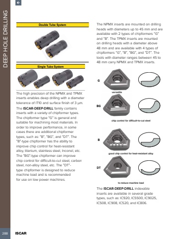 288 ISCAR DEEP HOLE DRILLINGDouble Tube SystemSingle Tube SystemThe high precision of the NPMX and TPMX inserts enables deep drilling with a diameter tolerance of IT10 and surface finish of 3 %u00b5m.The ISCAR-DEEP-DRILL family contains inserts with a variety of chipformer types. The chipformer type %u201cG%u201d is general and suitable for machining most materials. In order to improve performance, in some cases there are additional chipformer types, such as: %u201cB%u201d, %u201cBG%u201d, and %u201cDT%u201d. The %u201cB%u201d-type chipformer has the ability to improve chip control for heat-resistant alloy, titanium, stainless steel, Inconel, etc. The %u201cBG%u201d-type chipformer can improve chip control for difficult-to-cut steel, carbon steel, non-alloy steel, etc. The %u201cDT%u201d-type chipformer is designed to reduce machine load and is recommended for use on low power machines.The NPMX inserts are mounted on drilling heads with diameters up to 45 mm and are available with 2 types of chipformers %u201cG%u201dand %u201cB%u201d. The TPMX inserts are mounted on drilling heads with a diameter above 48 mm and are available with 4 types of chipformers %u201cG%u201d, %u201cB%u201d, %u201cBG%u201d, and %u201cDT%u201d. The tools with diameter ranges between 45 to 48 mm carry NPMX and TPMX inserts.GversatileBGchip control for difficult-to-cut steelBgood chip control for heat-resistant alloyDTto reduce machine loadThe ISCAR-DEEP-DRILL indexable inserts are available in several grade types, such as: IC920, IC5500, IC9025, IC508, IC908, IC520, and IC806.