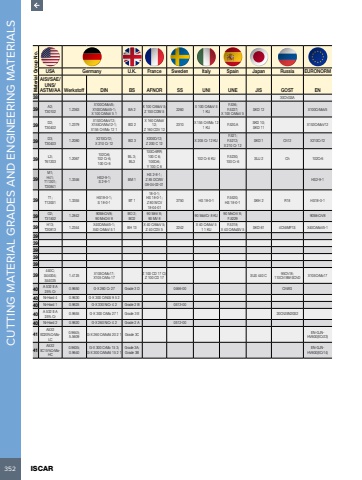 352 ISCAR CUTTING MATERIAL GRADES AND ENGINEERING MATERIALS Material Group No.USA Germany U.K. France Sweden Italy Spain Japan Russia EURONORMAISI/SAE/UNS/ASTM/AA Werkstoff DIN BS AFNOR SS UNI UNE JIS GOST EN38 30ChGSA39 A2;T30102 1.2363X100CrMoV5;X100CrMoV5-1;X 100 CrMoV 5 1BA 2 X 100 CrMoV 5;Z 100 CDW 5 2260 X 100 CrMoV 5 1 KUF.536;F.5227;X 100 CrMoV 5SKD 12 X100CrMoV539 D2;T30402 1.2379X153CrMoV12;X155CrVMo12-1;X155 CrVMo 12 1BD 2X 160 CrMoV 12;Z 160 CDV 122310 X 155 CrVMo 12 1 KU F.520.A SKD 10;SKD 11 X153CrMoV1239 D3;T30403 1.2080 X210Cr12;X 210 Cr 12 BD 3 X200Cr12;Z 200 C 12 X 205 Cr 12 KUF.521;F.5212;X 210 Cr 12SKD 1 Ch12 X210Cr1239 L3;T61203 1.2067102Cr6;102 Cr 6;100 Cr 6BL 3;BL3100Cr6RR;100 C 6;100Cr6;Y 100 C 6102 Cr 6 KU F.5230;100 Cr 6 SUJ 2 Ch 102Cr639M1;H41;T11301;T208411.3346 HS2-9-1;S 2-9-1 BM 1HS 2-8-1;Z 85 DCWV 08-04-02-01HS2-9-139 T1;T12001 1.3355 HS18-0-1;S 18-0-1 BT 118-0-1;HS 18-0-1;Z 80 WCV 18-04-012750 HS 18-0-1 F.5520;HS 18-0-1 SKH 2 R18 HS18-0-139 O2;T31502 1.2842 90MnCrV8;90 MnCrV 8BO 2;BO290 MnV 8;90 MV 8 90 MoVCr 8 KU 90 MnCrV 8;F.5229 90MnCrV839 H13;T20813 1.2344 X40CrMoV5-1;X40 CrMoV 5 1 BH 13 X 40 CrMoV 5;Z 40 CDV 5 2242 X 40 CrMoV 5 1 1 KUF.5318;X 40 CrMoSiV 5 SKD 61 4Ch5MF1S X40CrMoV5-1393939393939440C;S44004;S440251.4125 X105CrMo17;X105 CrMo 17Z 100 CD 17 CI;Z 100 CD 17 SUS 440 C 95Ch18;110Ch18M-SChD X105CrMo1740 A 532 lll A 25% Cr 0.9650 G-X 260 Cr 27 Grade 3 D 0466-00 ChWG40 Ni-Hard 4 0.9630 G-X 300 CrNiSi 9 5 240 Ni-Hard 1 0.9625 G-X 330 NiCr 4 2 Grade 2 B 0513-0040 A 532 lll A 25% Cr 0.9655 G-X 300 CrMo 27 1 Grade 3 E 20Ch25N20S240 Ni-Hard 2 0.9620 G-X 260 NiCr 4 2 Grade 2 A 0512-0041A532 IID20%CrMoLC0.9645;5.5609 G-X 260 CrMoNi 20 2 1 Grade 3C EN-GJNHV600(XCr23)41A532 IIC15%CrMoHC0.9635;0.9640G-X 300 CrMo 15 3;G-X 300 CrMoNi 15 2 1Grade 3A;Grade 3BEN-GJNHV600(XCr14)