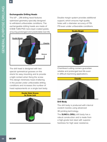 68 ISCAR GENERAL PURPOSE DRILLINGExchangeable Drilling HeadsThe ILP ...-2M drilling head features optimized geometry specially designed to withstand unfavorable conditions. The exchangeable drilling heads are made of IC908 TiAlN PVD nano-layer-coated grade, ensuring prolonged and predictable tool life. Double MarginChamferGrooveThe drill head is designed with two special symmetrical grooves on the shank for easy mounting and to provide a tight contact when fixing the screw. This design minimizes head chattering in the pocket under unfavorable drilling conditions and increases the number of head replacements on a single tool body. Double Sided Groovefor Screw LockDouble margin system provides additional support, which ensures high-quality holes with a diameter accuracy of IT8-IT9 even under unfavorable conditions.Double MarginChamfered cutting corners guarantee reliable and prolonged tool life even in difficult machining applications.ChamferDrill BodyThe drill body is produced with internal coolant nozzles using advanced3D printing technology. The SUMO-L-DRILL drill body has a robust construction and is made from a high-grade tool steel with superior hardness for high wear resistance.