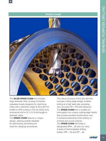 77GENERAL PURPOSE DRILLINGSPADE-CHAMThe ISCAR SPADE-CHAM line includes large diameter drills carrying innovative indexable heads designed for machining holes with a diameter range of 33 to 40 mm (1.299 to 1.575 inches) in 0.5 mm (0.02 inch) increments and a 1.5, 3, 5, 8 drill length to diameter ratios. The SPADE-CHAM features a unique design, utilizing carbide flexibility for self-locking, eliminating the need for clamping accessories. The robust structure of the drill with the concave cutting edge design enables drilling at a high feed rate, providing very accurate IT8 %u2013 IT9 hole tolerance. The SPADE-CHAM line is suitable for interrupted cuts, unique cutting-edge inserts that provide excellent performance and increased productivity when drilling on inclined and round surfaces. The SPADE-CHAM drill body is designated DFN %u2026-IQ and can carry 2 types of exchangeable drilling heads, HFP %u2026-IQ and IFP %u2026-IQ.