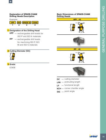 79GENERAL PURPOSE DRILLINGExplanation of SPADE-CHAM Drilling Heads Description Example:HFP 400 - SPADE IQ IC9081 2 3 41 Designation of the Drilling HeadHFP %u2014 exchangeable drill heads for ISO P and ISO K materialsIFP %u2014 exchangeable drill heads for machining ISO P, ISO M and ISO S materials2 Cutting Diameter (DC) DC3 GradeIC908Basic Dimensions of SPADE-CHAM Drilling HeadsHFP %u2026-IQLPRKCH 1.0DCLFIFP %u2026-IQLPRKCH 1.0DCLFDC %u2014 cutting diameterLPR %u2014 protruding lengthLF %u2014 functional lengthKCH %u2014 corner chamfer angleSIG %u2014 point angle