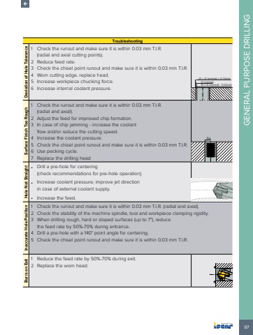 97GENERAL PURPOSE DRILLINGTroubleshootingDeviation of Hole Tolerance1 Check the runout and make sure it is within 0.03 mm T.I.R. (radial and axial cutting points).2 Reduce feed rate.3 Check the chisel point runout and make sure it is within 0.03 mm T.I.R.4 Worn cutting edge. replace head.5 Increase workpiece chucking force.6 Increase internal coolant pressure. D nominal%u00d8 > D nominal + 0.15mm%u00d8 < D nominal - 0.03mmSurface Finish Too Rough1 Check the runout and make sure it is within 0.03 mm T.I.R. (radial and axial).2 Adjust the feed for improved chip formation.3 In case of chip jamming - increase the coolant flow and/or reduce the cutting speed.4 Increase the coolant pressure.5 Check the chisel point runout and make sure it is within 0.03 mm T.I.R.6 Use pecking cycle.7 Replace the drilling headRaHole Not Straight%u2022 Drill a pre-hole for centering (check recommendations for pre-hole operation).%u2022 Increase coolant pressure; improve jet direction in case of external coolant supply.%u2022 Increase the feed.Inaccurate Hole Position1 Check the runout and make sure it is within 0.03 mm T.I.R. (radial and axial).2 Check the stability of the machine spindle, tool and workpiece clamping rigidity.3 When drilling rough, hard or sloped surfaces (up to 7%u00b0), reduce the feed rate by 50%-70% during entrance.4 Drill a pre-hole with a 140%u00b0 point angle for centering.5 Check the chisel point runout and make sure it is within 0.03 mm T.I.R.Burrs on Exit1 Reduce the feed rate by 50%-70% during exit.2 Replace the worn head.