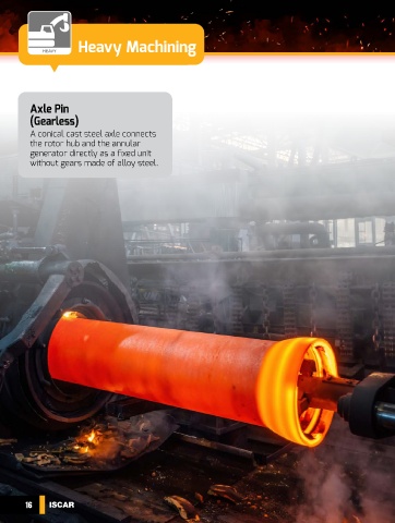 Heavy Machining HEAVY Axle Pin (Gearless) A conical cast steel axle connects the rotor hub and the annular generator directly as a fixed unit without gears made of alloy steel. 16 ISCAR