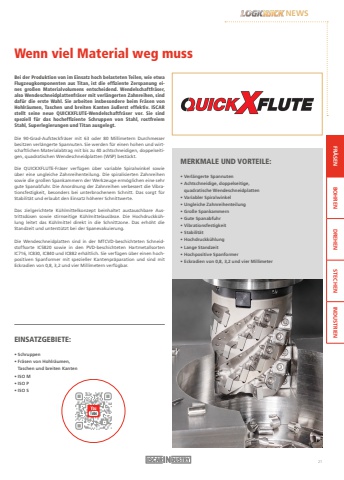 FR%u00c4SEN BOHREN DREHEN STECHEN INDUSTRIENWenn viel Material weg mussBei der Produktion von im Einsatz hoch belasteten Teilen, wie etwa Flugzeugkomponenten aus Titan, ist die effiziente Zerspanung eines gro%u00dfen Materialvolumens entscheidend. Wendelschaftfr%u00e4ser, also Wendeschneidplattenfr%u00e4ser mit verl%u00e4ngerten Zahnreihen, sind daf%u00fcr die erste Wahl. Sie arbeiten insbesondere beim Fr%u00e4sen von Hohlr%u00e4umen, Taschen und breiten Kanten %u00e4u%u00dferst effektiv. ISCAR stellt seine neue QUICKXFLUTE-Wendelschaftfr%u00e4ser vor. Sie sind speziell f%u00fcr das hocheffiziente Schruppen von Stahl, rostfreiem Stahl, Superlegierungen und Titan ausgelegt.Die 90-Grad-Aufsteckfr%u00e4ser mit 63 oder 80 Millimetern Durchmesser besitzen verl%u00e4ngerte Spannuten. Sie werden f%u00fcr einen hohen und wirtschaftlichen Materialabtrag mit bis zu 40 achtschneidigen, doppelseitigen, quadratischen Wendeschneidplatten (WSP) best%u00fcckt.Die QUICKXFLUTE-Fr%u00e4ser verf%u00fcgen %u00fcber variable Spiralwinkel sowie %u00fcber eine ungleiche Zahnreihenteilung. Die spiralisierten Zahnreihen sowie die gro%u00dfen Spankammern der Werkzeuge erm%u00f6glichen eine sehr gute Spanabfuhr. Die Anordnung der Zahnreihen verbessert die Vibrationsfestigkeit, besonders bei unterbrochenem Schnitt. Das sorgt f%u00fcr Stabilit%u00e4t und erlaubt den Einsatz h%u00f6herer Schnittwerte.Das zielgerichtete K%u00fchlmittelkonzept beinhaltet austauschbare Austrittsd%u00fcsen sowie stirnseitige K%u00fchlmittelausl%u00e4sse. Die Hochdruckk%u00fchlung leitet das K%u00fchlmittel direkt in die Schnittzone. Das erh%u00f6ht die Standzeit und unterst%u00fctzt bei der Spanevakuierung.Die Wendeschneidplatten sind in der MTCVD-beschichteten Schneidstoffsorte IC5820 sowie in den PVD-beschichteten Hartmetallsorten IC716, IC830, IC840 und IC882 erh%u00e4ltlich. Sie verf%u00fcgen %u00fcber einen hochpositiven Spanformer mit spezieller Kantenpr%u00e4paration und sind mit Eckradien von 0,8, 3,2 und vier Millimetern verf%u00fcgbar.EINSATZGEBIETE:%u2022 Schruppen %u2022 Fr%u00e4sen von Hohlr%u00e4umen, Taschen und breiten Kanten%u2022 ISO M%u2022 ISO P%u2022 ISO SMERKMALE UND VORTEILE:%u2022 Verl%u00e4ngerte Spannuten %u2022 Achtschneidige, doppelseitige, quadratische Wendeschneidplatten %u2022 Variabler Spiralwinkel %u2022 Ungleiche Zahnreihenteilung%u2022 Gro%u00dfe Spankammern %u2022 Gute Spanabfuhr%u2022 Vibrationsfestigkeit%u2022 Stabilit%u00e4t %u2022 Hochdruckk%u00fchlung %u2022 Lange Standzeit %u2022 Hochpositive Spanformer %u2022 Eckradien von 0,8, 3,2 und vier MillimeterNEWS21