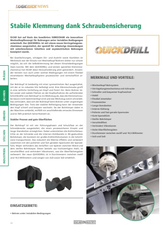 FR%u00c4SEN BOHREN DREHEN STECHEN INDUSTRIENNEWSStabile Klemmung dank SchraubensicherungISCAR hat auf Basis des bew%u00e4hrten SUMOCHAM ein innovatives Wechselkopfkonzept f%u00fcr Bohrungen unter instabilen Bedingungen entwickelt. Der QUICKDRILL ist mit einem neuen Verriegelungsmechanismus ausgestattet, der speziell f%u00fcr schwierige Anwendungen mit unterbrochenen Schnitten und asymmetrischen Bohrungen konzipiert wurde. Bei Querbohrungen, schr%u00e4gem Ein- und Austritt sowie Kavit%u00e4ten im Werkst%u00fcck war der Einsatz von Wechselkopf-Bohrern bisher nur schwer m%u00f6glich, da sich die Selbstklemmung bei diesen Einsatzbedingungen l%u00f6sen konnte. Mit dem QUICKDRILL und seinem speziellen Klemmmechanismus hat ISCAR diese Herausforderung jetzt gemeistert. Anwender k%u00f6nnen nun auch unter solchen Bedingungen mit einem flexibel einsetzbaren Wechselkopfsystem prozesssicher und wirtschaftlich arbeiten.Der Bohrkopf ist beidseitig mit einer symmetrischen Nut ausgestattet, mit der er im robusten Sitz befestigt wird. Eine Klemmschraube greift in eine seitliche Vertiefung am Kopf und fixiert ihn. Beim Bohren leiten axiale und radiale Fl%u00e4chen an der Kopfaufnahme die auftretenden Schnittkr%u00e4fte vom Bohrkopf so ins Werkzeug ab, dass die Klemmschraube davon nicht beeintr%u00e4chtigt wird und das Werkzeug weich schneidet.Das verhindert, dass sich der Bohrkopf beim Bohren unter ung%u00fcnstigen Bedingungen l%u00f6st. Trotz der stabilen Befestigung kann der Anwender den Kopf schnell und bequem wechseln. Da der Bohrk%u00f6rper dabei in der Maschine verbleibt, entf%u00e4llt ein anschlie%u00dfendes erneutes Einmessen und es f%u00e4llt praktisch keine R%u00fcstzeit an.Stabiler Prozess und gute Oberfl%u00e4chenDer Bohrkopf ist mit vier F%u00fchrungsphasen und Schutzfase an der Schneidenecke ausgestattet, die einen prozesssicheren Einsatz und lange Standzeiten erm%u00f6glichen. Dabei unterst%u00fctzen die K%u00fchlmittelaustritte an der Schneide und die internen K%u00fchlkan%u00e4le in 3D-gedruckten Bohrk%u00f6rper, die konstant ein gro%u00dfes K%u00fchlmittelvolumen in die Schnittzone transportieren. Das reduziert die W%u00e4rme effektiv und verbessert zusammen mit den polierten und fast geraden Spannuten die Spanabfuhr, Wiper verhindern das Anhaften von Sp%u00e4nen zwischen Wand und dem steifen Bohrk%u00f6rper. Dieser besteht aus hochwertigem Stahl, ist verschlei%u00dffest und verhindert Vibrationen, was die Oberfl%u00e4cheng%u00fcten verbessert. Der neue QUICKDRILL ist in Durchmessern zwischen zw%u00f6lf und 19,5 Millimetern und L%u00e4ngen von 3xD sowie 5xD erh%u00e4ltlich.MERKMALE UND VORTEILE:%u2022 Wechselkopf-Bohrsystem%u2022 Verriegelungsmechanismus mit Schraube%u2022 Schneller und bequemer Kopfwechsel%u2022 Stabil%u2022 Flexibel einsetzbar%u2022 Prozesssicher %u2022 Lange Standzeiten %u2022 Interne K%u00fchlung %u2022 Polierte und fast gerade Spannuten %u2022 Gute Spanabfuhr%u2022 Steifer Bohrk%u00f6rper %u2022 Verschlei%u00dffest %u2022 Verhindert Vibrationen%u2022 Hohe Oberfl%u00e4cheng%u00fcten %u2022 Durchmesser zwischen zw%u00f6lf und 19,5 Millimeter %u2022 3xD und 5xDEINSATZGEBIETE:%u2022 Bohren unter instabilen Bedingungen28