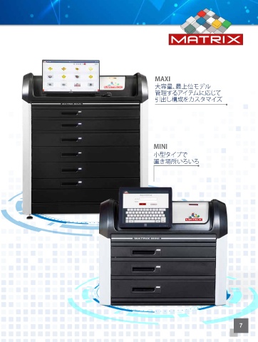 MAXI 大容量、最上位モデル 管理す ア イ テ ムに応 じ て る 引出 し構成をカスタマイ ズ MINI 小型タイプで 置き場所いろいろ 7