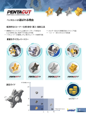 ペンタカットが選ばれる理由 経済的な5コーナー仕様 突切・溝入・旋削工具 • 高剛性クランプシステムと強化タイプチップの組合せ • ホルダー左右から簡単迅速にクランプ可能 により非常に高い条件下での加工が可能 • 1コーナーあたりのコストを削減 • 1つのコーナーが破損しても、残りのコーナーを使用可能 豊富なサイズレパートリー W 切削幅 (mm) 選定ガイド 20 27 8 高経済性チップ 24 3,6 17 34 T 切込み深さ (mm) 0 3 4 6 10
