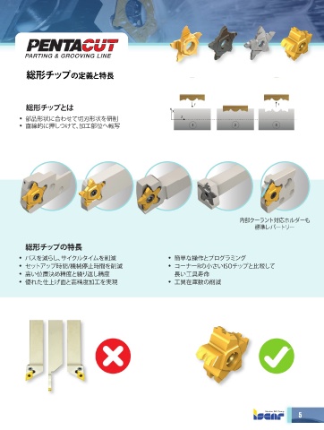 総形チップの定義と特長 f f 総形チップとは X • 部品形状に合わせて切刃形状を研削 Z • 直線的に押しつけて、加工部位へ転写 1 2 3 内部クーラント対応ホルダーも 標準レパートリー 総形チップの特長 • パスを減らし、サイクルタイムを削減 • 簡単な操作とプログラミング • セットアップ時間/機械停止時間を削減 • コーナーRの小さいISOチップと比較して • 高い位置決め精度と繰り返し精度 長い工具寿命 • 優れた仕上げ面と高精度加工を実現 • 工具在庫数の削減 5