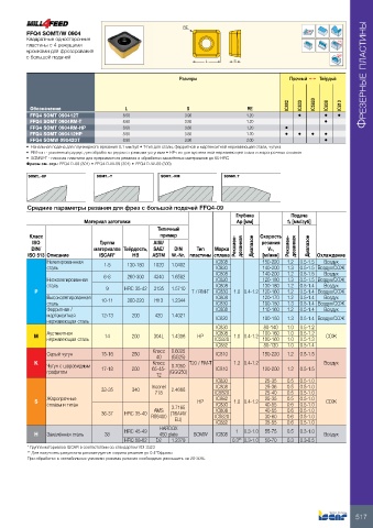 Средние параметры резания для фрез с большой подачей FFQ4-09