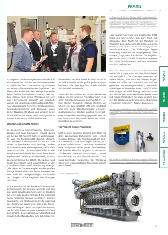PRAXISFR%u00c4SEN BOHREN DREHEN STECHEN INDUSTRIENzu ungenau. Die Bohrungen m%u00fcssen exakt aufeinandertreffen. Es kam jedoch immer wieder zu Verl%u00e4ufen. Trotz Vorzentrierung erzielten wir keine zufriedenstellenden Ergebnisse%u201c, erkl%u00e4rt Lukas Bachhuber. Sein Kollege Alexander Baier, Tooling Technologies, erg%u00e4nzt: %u201eWir haben intensiv nach einem Werkzeug mit sehr guter Performance gesucht%u201c und erl%u00e4utert, warum die langj%u00e4hrigen Kontakte zu ISCAR einen L%u00f6sungsansatz lieferten. Dirk Moosreiner, Anwendungstechnik und Beratung, sowie Detlef Ossadnik, Beratung und Verkauf, beide ISCAR, stellten das neue, dreischneidige Wechselkopf-Bohrsystem LOGIQ3CHAM vor.LOGIQ3CHAM schafft AbhilfeIm Vergleich zu konventionellen Bohrwerkzeugen mit zwei Schneiden erlaubt dieses um bis zu 100 Prozent h%u00f6here Vorschubwerte, was die Produktivit%u00e4t deutlich steigert.Das Bohrkopf-Klemmsystem ist einfach und sicher zu handhaben und ben%u00f6tigt, anders als konventionelle Klemmsysteme, keine weiteren Ersatzteile. %u201eSo entstehen selbst in der Maschine nur minimale R%u00fcstzeiten beim Bohrkopfwechsel%u201c, erl%u00e4utert Florian Wei%u00df, Product Specialist Drilling bei ISCAR. Die radiale und axiale Klemmkraft wird ausschlie%u00dflich in der schwalbenschwanz%u00e4hnlichen Passung erzeugt.%u201eSie bietet im Zusammenspiel mit den gro%u00dfen Anlagefl%u00e4chen eine sehr hohe Prozesssicherheit auch bei unregelm%u00e4%u00dfigen Schnittkr%u00e4ften%u201c, erg%u00e4nzt ISCAR Regional Sales Manager Uli K%u00f6hler.ISCAR konzipierte das Bohrkopf-Zentrum beziehungsweise die Restquerschneide mit den drei spitz zulaufenden Schneiden im Hinblick auf eine gute Zentrierf%u00e4higkeit bei m%u00f6glichst hoher Stabilit%u00e4t. Daraus resultieren geringe Axialkr%u00e4fte und Drehmomentwerte w%u00e4hrend des Anbohrens sowie eine sehr gute Eigenzentrierf%u00e4higkeit. Beim LOGIQ3CHAM kommt der PVD-TiAIN-beschichtete Schneidstoff IC908 zum Einsatz. Dieser ist hoch verschlei%u00dffest und erlaubt hohe Standzeiten. Alle Bohrk%u00f6rpervarianten besitzen eine innere K%u00fchlmittelzufuhr an jede Schneide sowie gro%u00dfe, polierte Spankammern, die den Spanfluss durch variable Spiralwinkel verbessern.%u201eNach der Vorstellung des neuen Werkzeugs haben wir mit unseren Projektpartnern Tests unter Praxisbedingungen durchgef%u00fchrt%u201c, erkl%u00e4rt Detlef Ossadnik. %u201eDabei stellten wir schnell fest, dass LOGIQ3CHAM sehr rund l%u00e4uft und eine hohe Oberfl%u00e4cheng%u00fcte erzeugt%u201c, sagt Moosreiner. Weitere positive Testergebnisse haben den Ausschlag gegeben, das bisher eingesetzte Werkzeug durch die ISCARInnovation zu ersetzen.100 Prozent h%u00f6here Vorsch%u00fcbeMAN Energy Solution arbeitet seit 2022 mit dem Wechselkopf-Bohrsystem und erzielt messbare Erfolge. %u201eDie Fluchtung hat sich deutlich verbessert. Die Bohrungen treffen jetzt pr%u00e4zise aufeinander%u201c, berichtet Alexander Baier. Aufgrund seiner guten Zentrierf%u00e4higkeit arbeitet MAN im Vergleich zu vorher mit 100 Prozent h%u00f6heren Vorsch%u00fcben. %u201eUnsere Produktivit%u00e4t hat sich deutlich erh%u00f6ht%u201c, fasst Lukas Bachhuber zusammen. Das Werkzeug ist auf den leistungsstarken Maschinen schnell einsatzbereit.%u201eWir sparen f%u00fcnf Euro pro Bauteil. Bei 1.000 St%u00fcck pro Jahr rechnet sich das%u201c, freut sich Alexander Baier. MAN hat die Standzeit im Vergleich zum vorherigen Werkzeug um zehn Prozent erh%u00f6ht. Gesunken sind hingegen die Ausschuss-Kosten. %u201eDie Bohrungen liegen durchweg innerhalb der vorgegebenen Toleranzen%u201c, sagt Lukas Bachhuber. Die Augsburger setzen LOGIQ3CHAM in den Durchmessern von 18 bis 24 Millimetern und den Bohrtiefen von 5xD und 8xD ein.Von der Pr%u00e4sentation bis zum Praxiseinsatz verlief die Kooperation mit den ISCAR-Experten vorbildlich. %u201eDie Kontakte bestehen seit vielen Jahren, und auch bei diesem Projekt haben wir offen, vertrauensvoll und auf Augenh%u00f6he zusammengearbeitet%u201c, beschreibt MAN-Experte Alexander Baier. LOGIQ3CHAM %u00fcberzeugte bei MAN Energy Solutions rundum. %u201eDie pr%u00e4zise und zuverl%u00e4ssige Bearbeitung mit hohen Vorsch%u00fcben hat dazu gef%u00fchrt, dass wir das Werkzeug auch bei anderen Bauteilen erfolgreich einsetzen%u201c, fasst er zusammen.Mit dem Wechselkopfbohrsystem LOGIQ3CHAM von ISCARerzielt MAN Energy Solutions deutliche Produktivit%u00e4tsVorteile.Der gr%u00f6%u00dfte bei MAN Energy Solutions hergestellte Motor hateine Leistung von 19 Megawatt und ist 240 Tonnen schwer.Im Team zum Erfolg (v.l.): Florian Wei%u00df, Product SpecialistDrilling, Detlef Ossadnik, Beratung und Verkauf, Uli K%u00f6hler, Regional Sales Manager, alle ISCAR, Lukas Bachhuber, Segmentleiter, und Alexander Baier, Tooling Technologies, beide MAN Energy Solutions.%u00a9 MAN Energy Solutions25