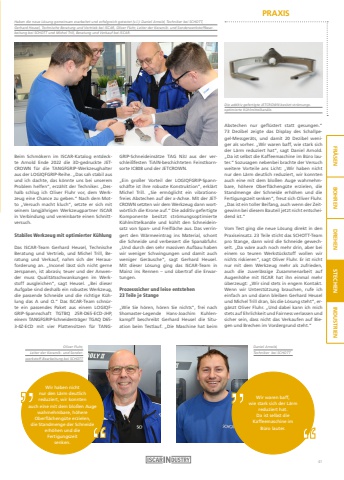 PRAXISFR%u00c4SEN BOHREN DREHEN STECHEN INDUSTRIENWir haben nicht nur den L%u00e4rm deutlich reduziert, wir konnten auch eine mit dem blo%u00dfen Auge wahrnehmbare, h%u00f6here Oberfl%u00e4cheng%u00fcte erzielen, die Standmenge der Schneide erh%u00f6hen und die Fertigungszeit senken.Wir waren baff, wie stark sich der L%u00e4rm reduziert hat. Da ist selbst die Kaffeemaschine im B%u00fcro lauter.Oliver Fluhr, Leiter der Keramik- und Sonderwerkstoff-Bearbeitung bei SCHOTTDaniel Arnold,Techniker bei SCHOTTHaben die neue L%u00f6sung gemeinsam erarbeitet und erfolgreich getestet (v.l.): Daniel Arnold, Techniker bei SCHOTT, Gerhard Heusel, Technische Beratung und Vertrieb bei ISCAR, Oliver Fluhr, Leiter der Keramik- und Sonderwerkstoffbearbeitung bei SCHOTT und Michel Trill, Beratung und Verkauf bei ISCAR.Beim Schm%u00f6kern im ISCAR-Katalog entdeckte Arnold Ende 2022 die 3D-gedruckte JETCROWN f%u00fcr die TANGFGRIP-Werkzeughalter aus der LOGIQFGRIP-Reihe. %u201eDas sah stabil aus und ich dachte, das k%u00f6nnte uns bei unserem Problem helfen%u201c, erz%u00e4hlt der Techniker. %u201eDeshalb schlug ich Oliver Fluhr vor, dem Werkzeug eine Chance zu geben.%u201c Nach dem Motto %u201eVersuch macht kluch%u201c, setzte er sich mit seinem langj%u00e4hrigen Werkzeugpartner ISCAR in Verbindung und vereinbarte einen Schnittversuch.Stabiles Werkzeug mit optimierter K%u00fchlungDas ISCAR-Team Gerhard Heusel, Technische Beratung und Vertrieb, und Michel Trill, Beratung und Verkauf, nahm sich der Herausforderung an. %u201eInconel l%u00e4sst sich nicht gerne zerspanen, ist abrasiv, teuer und der Anwender muss Qualit%u00e4tsschwankungen im Werkstoff ausgleichen%u201c, sagt Heusel. %u201eBei dieser Aufgabe sind deshalb ein robustes Werkzeug, die passende Schneide und die richtige K%u00fchlung das A und O.%u201c Das ISCAR-Team schn%u00fcrte ein passendes Paket aus einem LOGIQFGRIP-Spannschaft TGTBQ 25R-D65-ECD-JHP, einem TANGFGRIP-Schneidentr%u00e4ger TGAQ D65-3-4Z-ECD mit vier Plattensitzen f%u00fcr TANGGRIP-Schneideins%u00e4tze TAG N3J aus der verschlei%u00dffesten TiAlN-beschichteten Feinstkornsorte IC808 und der JETCROWN.%u201eEin gro%u00dfer Vorteil der LOGIQFGRIP-Spannsch%u00e4fte ist ihre robuste Konstruktion%u201c, erkl%u00e4rt Michel Trill. %u201eSie erm%u00f6glicht ein vibrationsfreies Abstechen auf der x-Achse. Mit der JETCROWN setzten wir dem Werkzeug dann wortw%u00f6rtlich die Krone auf.%u201c Die additiv gefertigte Komponente besitzt str%u00f6mungsoptimierte K%u00fchlmittelkan%u00e4le und k%u00fchlt den Schneideinsatz von Span- und Freifl%u00e4che aus. Das verringert den W%u00e4rmeeintrag ins Material, schont die Schneide und verbessert die Spanabfuhr.%u201eUnd durch den sehr massiven Aufbau haben wir weniger Schwingungen und damit auch weniger Ger%u00e4usche%u201c, sagt Gerhard Heusel.Mit dieser L%u00f6sung ging das ISCAR-Team in Mainz ins Rennen %u2013 und %u00fcbertraf die Erwartungen.Prozesssicher und leise entstehen 23 Teile je Stange%u201eWie Sie h%u00f6ren, h%u00f6ren Sie nichts%u201c, frei nach Shomaster-Legende Hans-Joachim Kuhlenkampff beschreibt Gerhard Heusel die Situation beim Testlauf. %u201eDie Maschine hat beim Abstechen nur gefl%u00fcstert statt gesungen.%u201c 73 Dezibel zeigte das Display des Schallpegel-Messger%u00e4ts, und damit 20 Dezibel weniger als vorher. %u201eWir waren baff, wie stark sich der L%u00e4rm reduziert hat%u201c, sagt Daniel Arnold.%u201eDa ist selbst die Kaffeemaschine im B%u00fcro lauter.%u201c Sozusagen nebenbei brachte der Versuch weitere Vorteile ans Licht: %u201eWir haben nicht nur den L%u00e4rm deutlich reduziert, wir konnten auch eine mit dem blo%u00dfen Auge wahrnehmbare, h%u00f6here Oberfl%u00e4cheng%u00fcte erzielen, die Standmenge der Schneide erh%u00f6hen und die Fertigungszeit senken%u201c, freut sich Oliver Fluhr.%u201eDas ist ein toller Beifang, auch wenn der Zeitgewinn bei diesem Bauteil jetzt nicht entscheidend ist.%u201c Vom Test ging die neue L%u00f6sung direkt in den Praxiseinsatz. 23 Teile sticht das SCHOTT-Team pro Stange, dann wird die Schneide gewechselt. %u201eDa w%u00e4re auch noch mehr drin, aber bei einem so teuren Werkst%u00fcckstoff wollen wir nichts riskieren%u201c, sagt Oliver Fluhr. Er ist nicht nur mit dem Werkzeug mehr als zufrieden, auch die zuverl%u00e4ssige Zusammenarbeit auf Augenh%u00f6he mit ISCAR hat ihn einmal mehr %u00fcberzeugt: %u201eWir sind stets in engem Kontakt.Wenn wir Unterst%u00fctzung brauchen, rufe ich einfach an und dann bleiben Gerhard Heusel und Michel Trill dran, bis die L%u00f6sung steht%u201c, erg%u00e4nzt Oliver Fluhr. %u201eUnd dabei kann ich mich stets auf Ehrlichkeit und Fairness verlassen und sicher sein, dass nicht das Verkaufen auf Biegen und Brechen im Vordergrund steht.%u201c Die additiv gefertigte JETCROWN besitzt str%u00f6mungsoptimierte K%u00fchlmittelkan%u00e4le.41