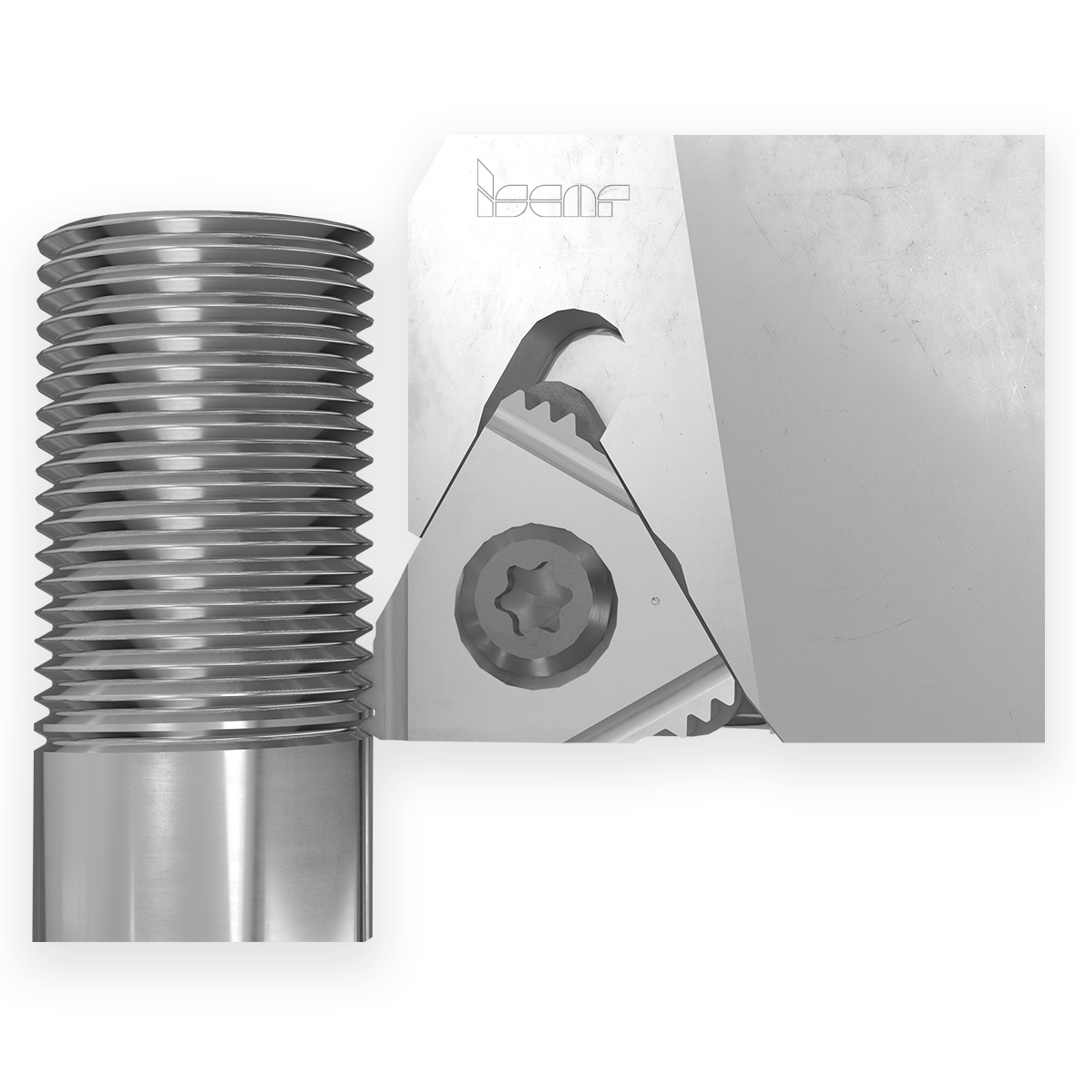 除了ISO标准平装刀片,伊斯卡还提供高刚性设计的立装螺纹刀片。立装螺纹刀片根据应用分为内螺纹加工及外螺纹加工。与ISO标准平装刀片系列相反,这些刀片后角均为磨制。 PENTACUT五角霸王刀是伊斯卡成功的立装螺纹刀片系列之一。PENTACUT螺纹刀片带来以下优势:带5个切削刃,提供高性价比解决方案;配置有压制断屑槽,实现高效切屑控制;强固设计,实现更高切削参数,提高生产率;通用牙型刀片的设计用于接近于台肩的加工,切削刃可任意切换;用于加工右旋螺纹及左旋螺纹;具有加工外槽槽底处螺纹的能力。(fig4)