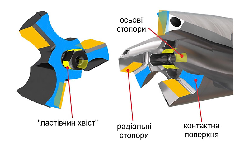 - місце базування інструменту має форму «ластівчин хвіст», яка надійно фіксує та запобігає випаданню голівки з корпусу під час процесу різання.